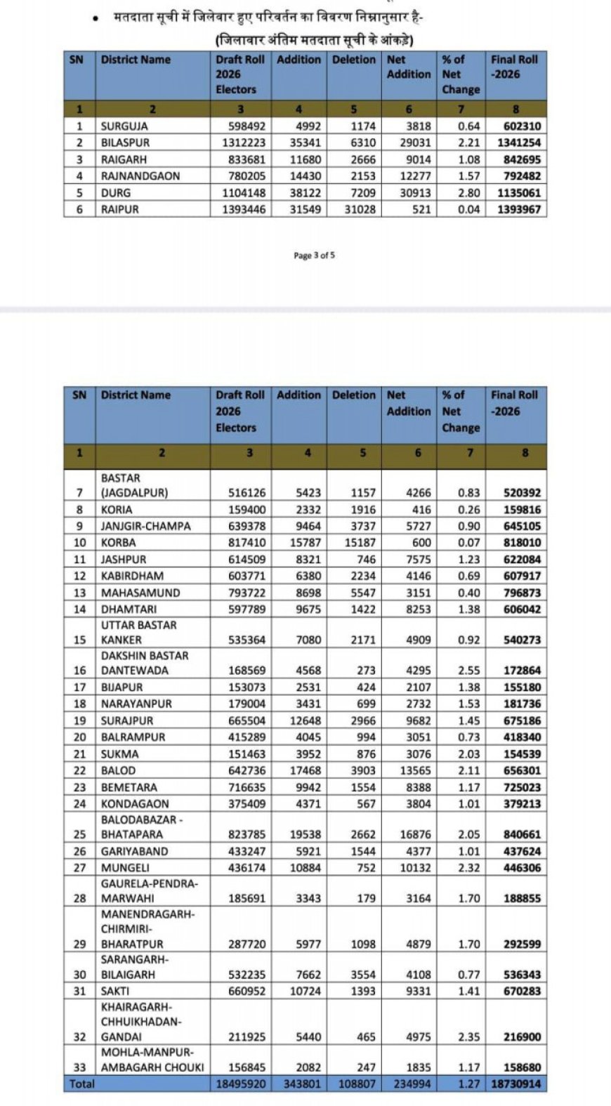 भारत निर्वाचन आयोग, नई दिल्ली के निर्देशानुसार छत्तीसगढ़ राज्य में निर्वाचक नामावलियों का विशेष गहन पुनरीक्षण (एसआईआर) अभियान शुरू किया गया है। राज्य भर में दिनांक 27 अक्टूबर 2025 से शुरू हुए और चार महीने तक लगातार चले एसआईआर (विशेष गहन पुनरीक्षण) अभियान के विभिन्न चरणों के प्रभावी संचालन के बाद आज दिनांक 21.02.2026 को निर्वाचक नामावली की अंतिम प्रकाशन किया गया। मतदाता सूची में अपना नाम शामिल कराने, मतदाता सूची से अपना नाम हटवाने या प्रविष्टियों में संशोधन से संबंधित दावे और आपत्तियां दिनांक 23.12.2025 से 22.01.2026 के बीच प्रस्तुत किए गए थे। प्राप्त दावे आपत्तियों का निराकरण दिनांक 14 फरवरी 2026 तक किया गया।